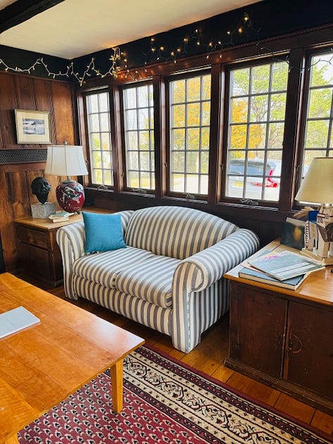 In the main living room, there are two couches, including the one above. On another wall, there’s a painting of the same spot. I don’t know who painted it or when. When I pull off the blanket covering the couch, I see the stripes, the shape.